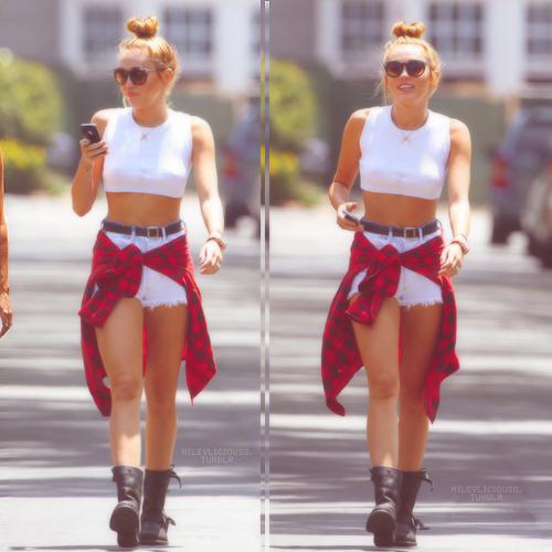 I think this outfit is very girly and very funny. I love her pink blazer whit black sleeves and the same pink boots and Miley Cyrus has the same but her`s are yellow. I also love her blue shirt and that she has black tights whit small black polka dot under the skirt. I don`t like the black shirt because it`s has strange shape I would wear different one. I like the small black nerd glasses. I think this outfit is hit.